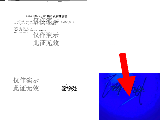 使用紫光灯照射Tskhd签名处可看见荧光点